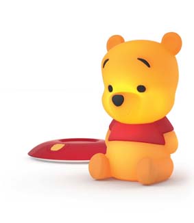 Bébé5N’oublions pas aussi la veilleuse, un petit objet pratique, qui va plaire autant aux parents qu’à bébé. La garantie d’une bonne nuit tranquille cela n’a pas de prix ! Winnie l’Ourson de Philips Disney est un doudou lumineux qui éclaire en douceur la chambre. Les petits plus : bébé peut l’emmener dans son lit. Il suffit de charger sur son socle cette veilleuse portable et la voila prête pour la nuit. L’éteindre est très facile : on retourne Winnie. Prix de la veilleuse : 39,95 euros.