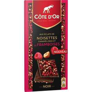 Pourquoi on l’aime : pour sa richesse en goût et surtout le côté craquant du mélange fruits secs caramélisés et chocolat. On croque, on craque ! Le packaging est aussi tentateur avec sa découpe qui montre les éclats gourmands de noisettes caramélisées et une pointe de rouge pour la tablette aux framboises (mon préféré !).