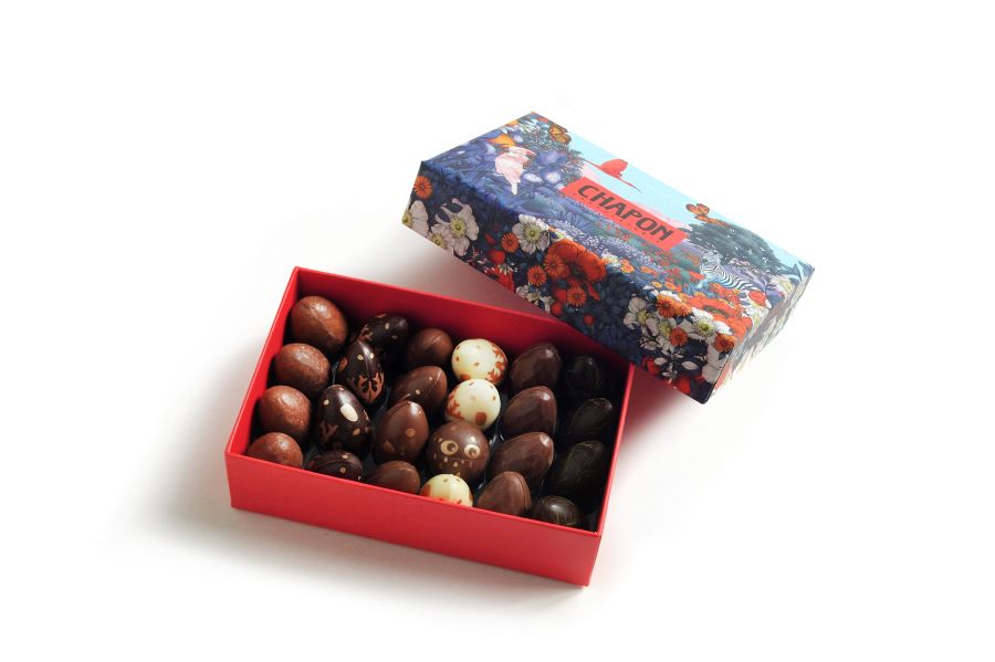 Coup de cœur pour le Chaton Garni (25,50 €) et le Coffret d’œufs signature (45 €). Ils reprennent les chocolats emblématiques de la maison et ils sont renversants !