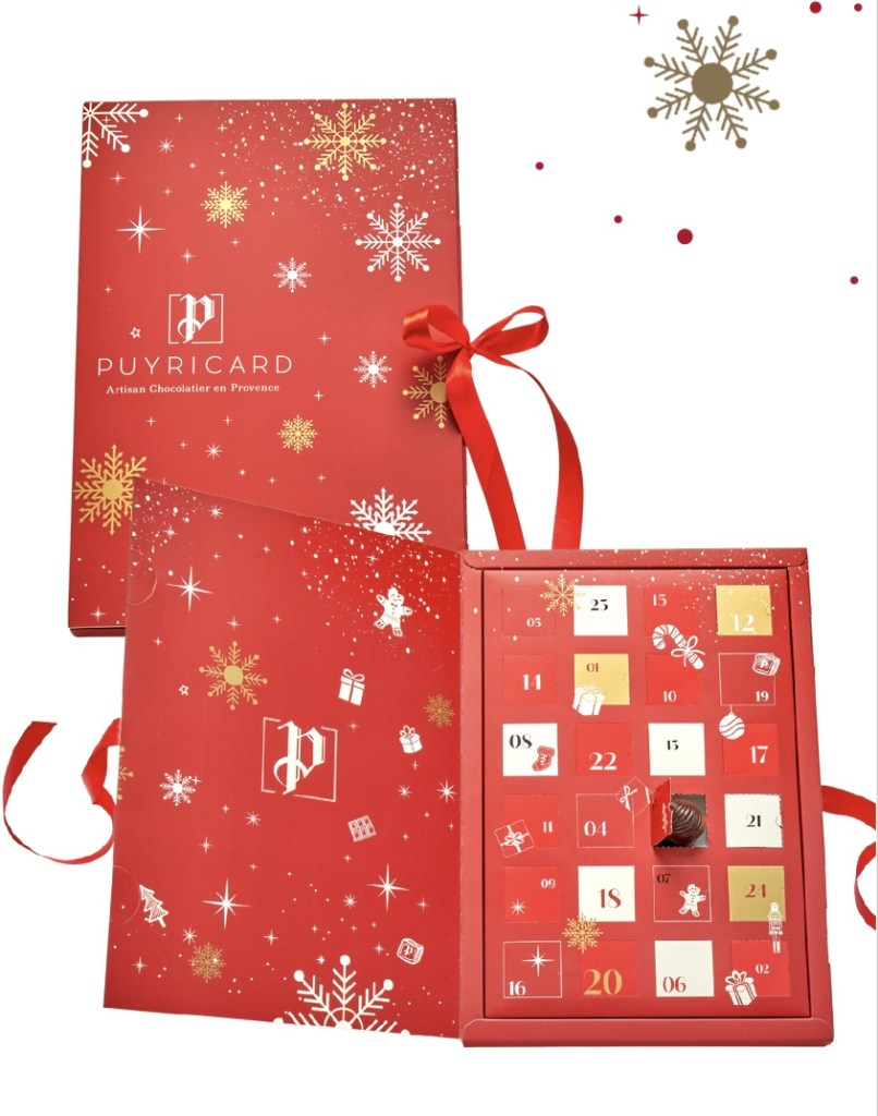 Parce qu’on ne résiste pas x créations de cet artisan chocolatier de Provence je vous présente son calendrier de l’avent qui donne un avant-gout de ses créations chocolat, en version noir ou au lait mais aussi de ses orangettes, nougats, pates de fruits, amandas… Trop bon ! les plus : on peut choisir sa version et le coffret est réutilisable. À partir de 33 €