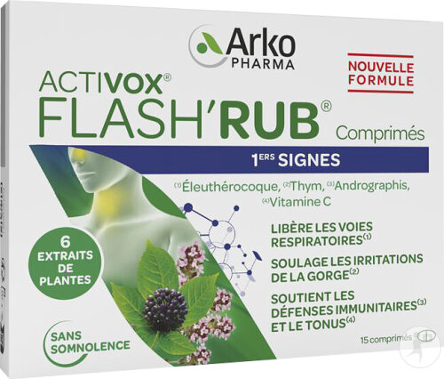 Si, malgré tout, un vilain rhume parvient à nous attraper, pas de panique : Activox Flash Rub est là. Ce soin, sous forme de 15 comprimés, contient du marrube blanc et de l’éleuthérocoque pour faciliter le confort respiratoire, du thym pour adoucir et apaiser la gorge, de l’andrographis pour soutenir le système immunitaire, ainsi que de la vitamine C pour réduire la fatigue. Une solution rapide et complète qui agit dès les premiers signes.