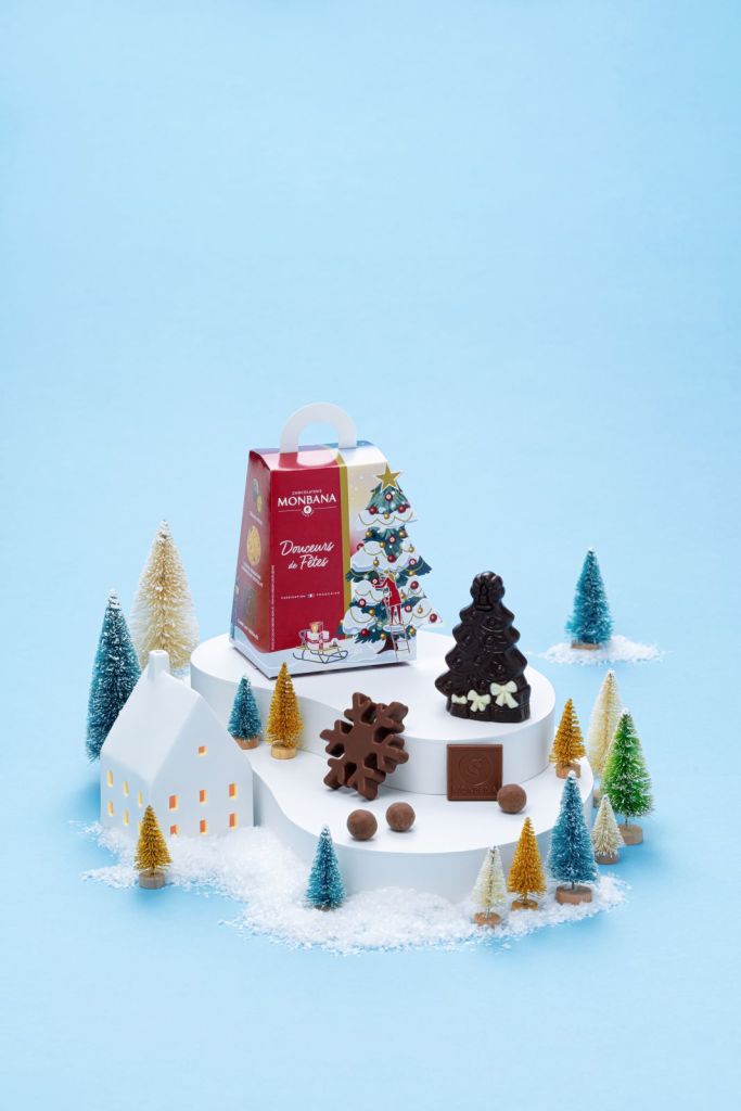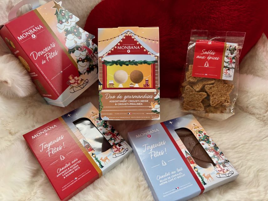 Cette chocolaterie française fière de 90 ans d’histoire, présente cette année un joli univers hivernal qui dissimule des boules Crousti-Pralinea et Crousti-Neige, des cookies nougatine et pépites de chocolat, des Praliz pétillant, des Carrés Neige… Les sablés aux épices sont délicieux et ils sentent bon l’esprit de Noel.  Et les sapins à croquer en chocolat au lait ou chocolat noir avec décor chocolat blanc sont aussi beaux que bons. A partir de 5,90 €