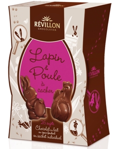 Revillon. Futées, les savoureuses figurines de lapins et de poules au chocolat au lait au cœur fondant, sont emballées individuellement dans des adorables petits sachets pour mieux se cacher partout ! (6,95 € la boite de 26 personnages)