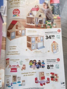 Il y en a pour tous les goûts : des accessoires de cuisine comme une machine à café ou un grille-pain à 9,99 €, des maisons de poupée en bois à partir de 34,99 €, des ensemble de meubles miniatures à 9,99 €, des fermes des maisons ou des supermarchés à 16, 99 €, des bateaux pirates 29,99 €,des circuits 21,99 €, des draisiennes à 29, 99 €, des véhicules miniatures aimantés, sonores, lumineux … et j’en passe…