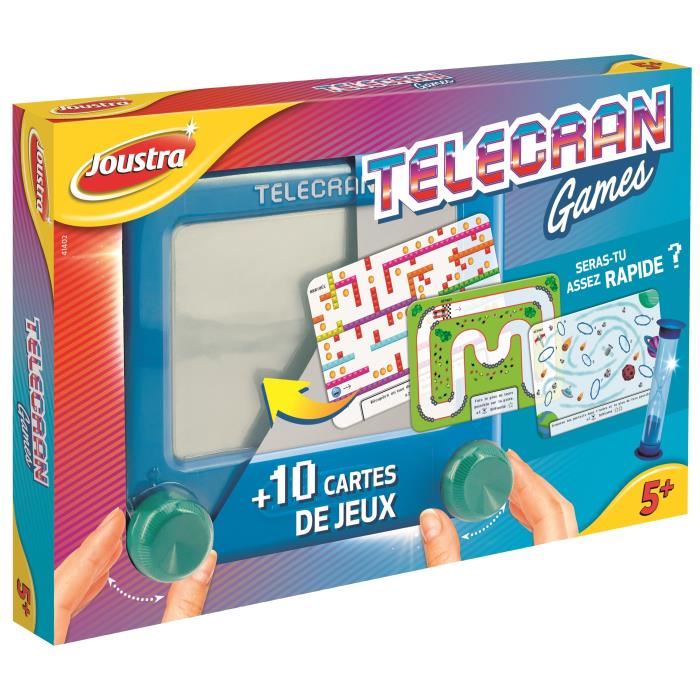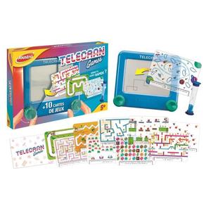 Oh comme il nous rappelle des souvenirs ce télécran. Le principe est toujours le même : on tourne les boutons de droite et de gauche pour tracer des traits verticaux et horizontaux, mais ses couleurs ont changé et en plus il propose 10 cartes de jeux et 1 sablier pour jouer seul ou à plusieurs. Il y a des labyrinthes, des casse-têtes, des courses. Trop bien ! On adore et ça change des tablettes !!!
