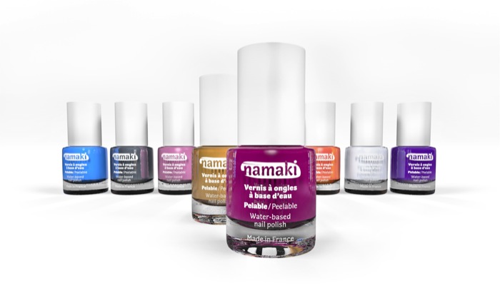 qui sèchent très rapidement et s’enlèvent sans dissolvant comme un vernis à ongle. Trop bien, Namaki fait même des vernis à l’eau pelable Or, argent !